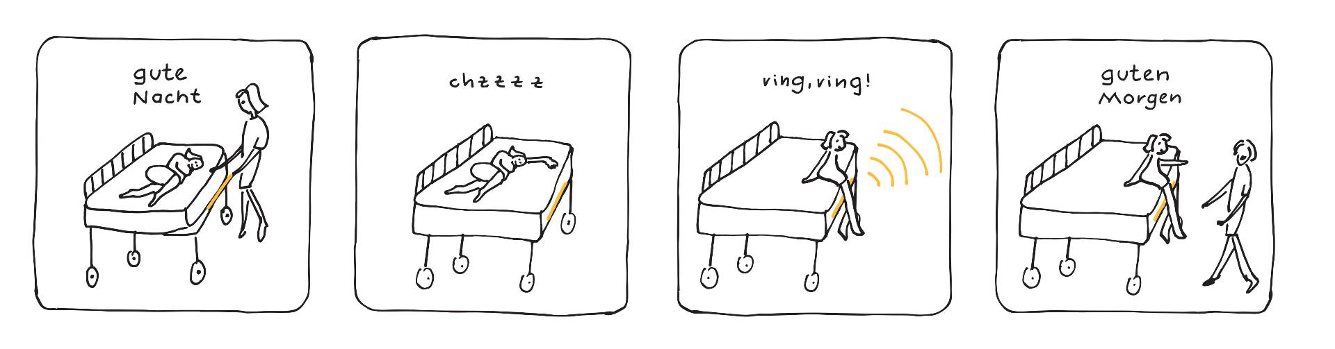 Bei der Konzeption des Bucinators war es wichtig, eine einfache, verlässliche und sichere Lösung zu gestalten. So ist mit Bucinator Paulus eine Bettkanten-Sensorik entstanden, die einen Hilferuf auslöst, noch bevor die betreffende Person sich aus dem Bett bewegt hat.