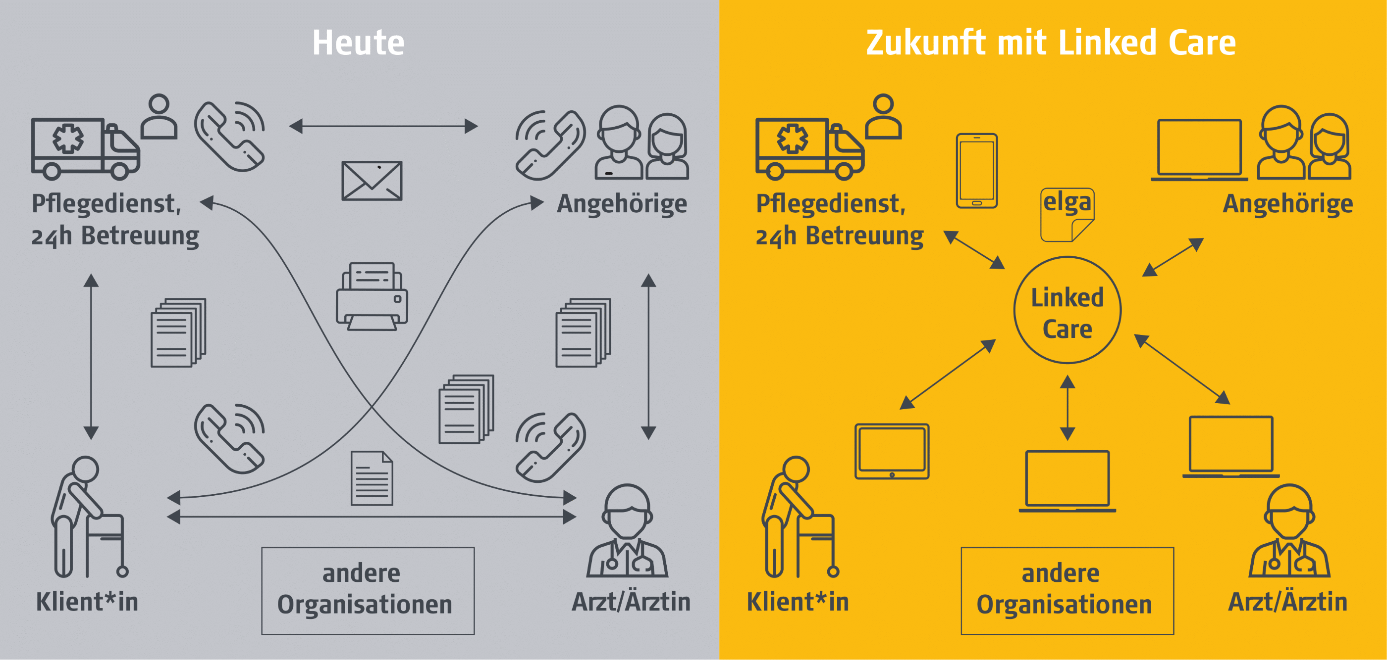 Verbesserte intersektorale Abläufe haben weitere positive Effekte. Primär führt die Anwendung zu geringeren Informationsbrüchen sowie vermindertem Dokumentationsaufwand durch Reduktion von Mehrfachdokumentationen in der mobilen Pflege, Betreuung und Therapie. Darüber hinaus werden durch Linked Care die Qualität und Effizienz der Pflege und Betreuung gesteigert und Daten für alle am Versorgungsprozess beteiligten Personen und Berufsgruppen besser und schneller verfügbar gemacht.