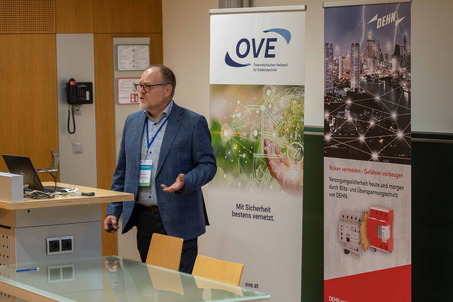 Stephan Pack (Vorsitzender des TK BL „Blitzschutz“) berichtete aus der Forschungspraxis des Hochspannungsprüffelds an der TU Graz und präsentierte eindrucksvolle Versuche zur Simulation von Blitzentladungen. In der geschützten Laborumgebung wurden mit künstlichen Blitzstoßspannungen und -strömen reale Einschlagszenarien nachgestellt.