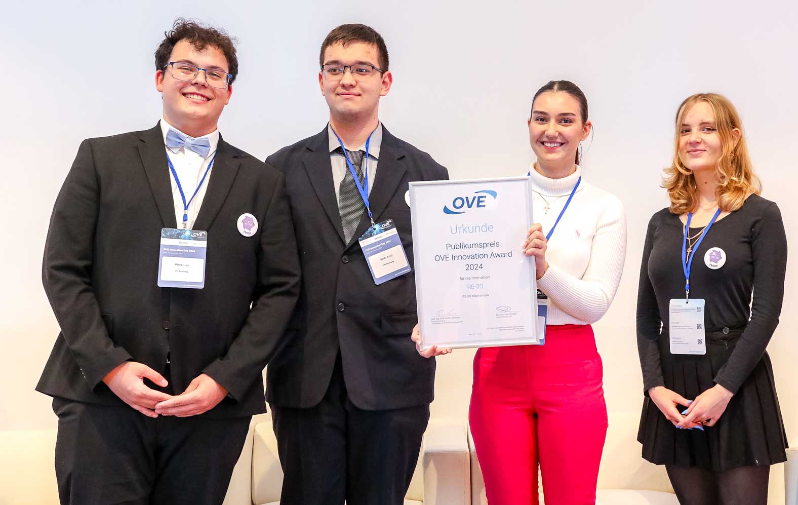Neu war in diesem Jahr die Einführung eines Publikumspreises: Von der Jury nominierte Projekte wurden während des OVE Innovation Day in 60-sekündigen Pitches vorgestellt. Die meisten Stimmen erhielt eine Gruppe von Schüler:innen der HTL Wien 3 Rennweg für ihr Projekt zur Wiederverwertung von Abfällen aus fehlerhaften 3D-Drucken.