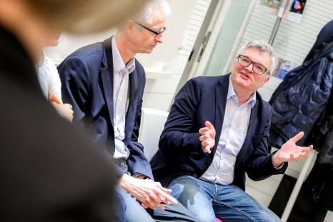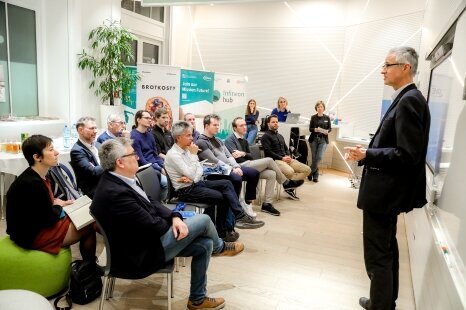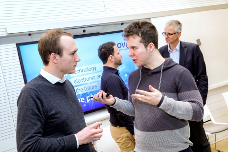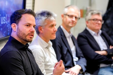 Bei der folgenden Podiumsdiskussion kam noch Peter Rössler dazu, Studiengangsleiter Elektronik und Wirtschaft sowie Forschungsschwerpunktverantwortlicher Embedded Systems & Cyber-Physical Systems an der FH Technikum Wien.