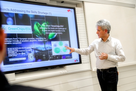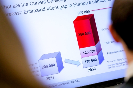 Als nächstes präsentierte Bernd Deutschmann, Leiter des Instituts für Elektronik an der TU Graz. Thema seines Impulsvortrags: Ein gesamteuropäischer Überblick und welche Rolle der Fachkräftemangel im Zusammenhang mit dem European Chips Act spielt. In den kommenden Jahren steigt der Bedarf an qualifizierten Fachkräften in der Halbleiterindustrie und Elektronikproduktion weiter an. Mehr als 350.000 Fachkräfte werden für die Umsetzung des European Chips Act benötigt. Auch Bernd Deutschmann sieht besonders im Bereich GreenChips und dem dahinter stehenden "Purpose" eine große Chance, um die Expert:innen von morgen für die Branche zu begeistern.