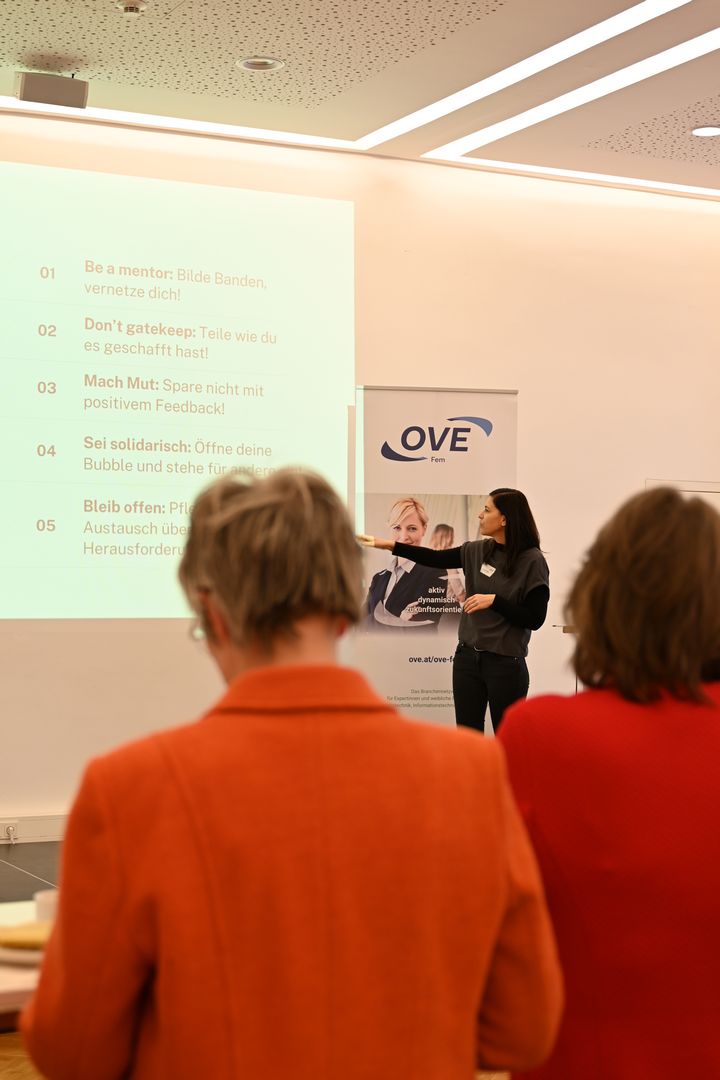 Tipp Nr. 2 „Don’t gatekeep: Teile, wie du es geschafft hast!“ bildete dann gleich das Motto für die anschließenden Kurzinterviews mit den beiden „Female Leadership Role Models“ Christine Materazzi-Wagner und Pia Burchhart, die uns von ihrem Weg in ihre leitenden Positionen allen Teilnehmerinnen auch ihre ganz persönlichen Botschaften mitgaben: