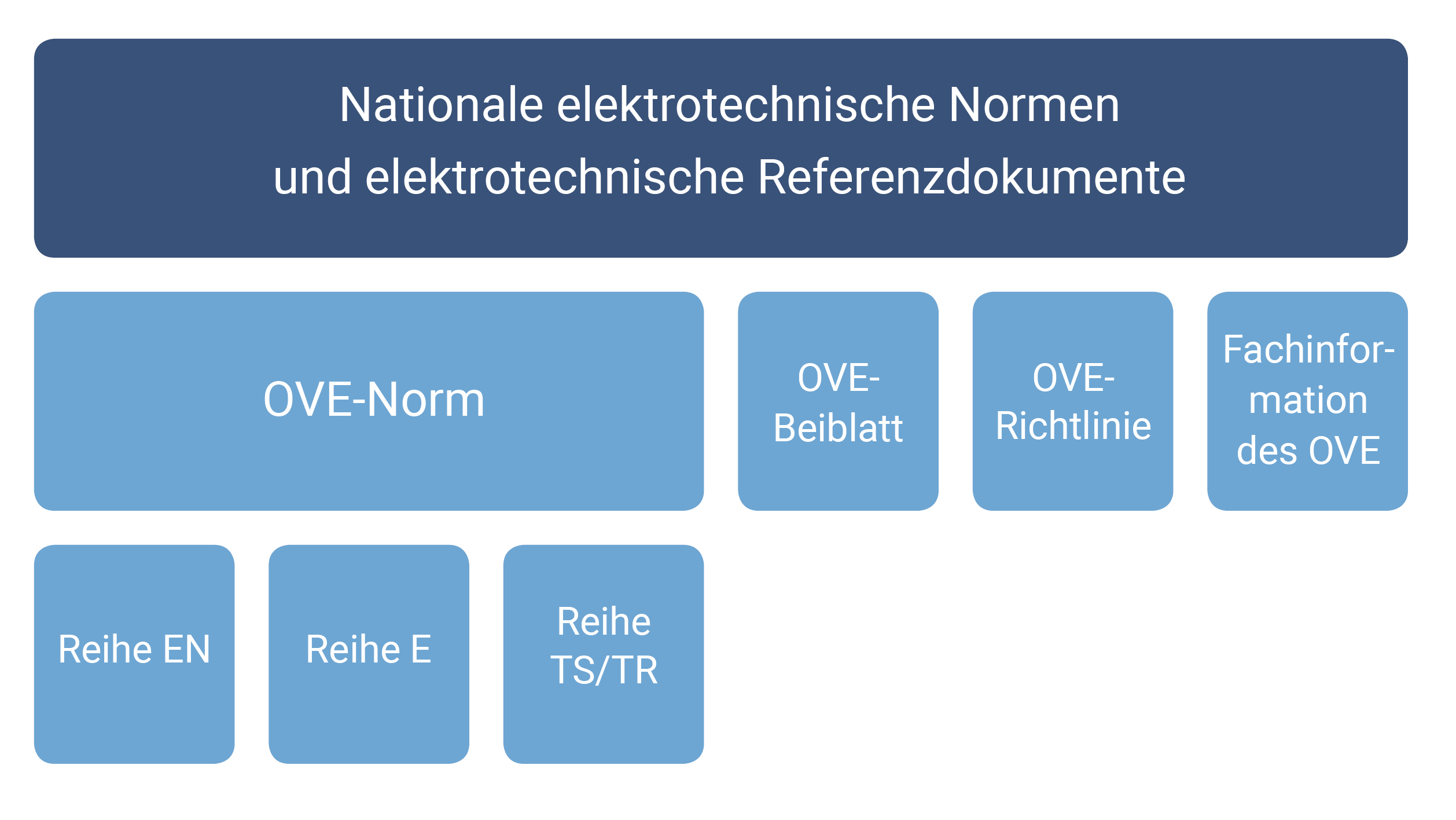 | OVE-Norm | Normatives Dokument, das von einem Technischen Komitee des OVE erarbeitet bzw. angenommen wurde. Die Erstellung einer OVE-Norm unterliegt den Regeln des Konsens- und öffentlichen Einspruchsverfahrens. Reihe EN: Verpflichtende Übernahme der Europäischen Normen von CENELEC in das nationale Normenwerk. Reihe E: National erarbeitete Norm bzw. Übernahme eines Europäischen Harmonisierungsdokuments oder einer IEC Publikation. Reihe TS/TR: Nationale Übernahme einer Technischen Spezifikation oder eines Technischen Reports von CENELEC oder IEC. |