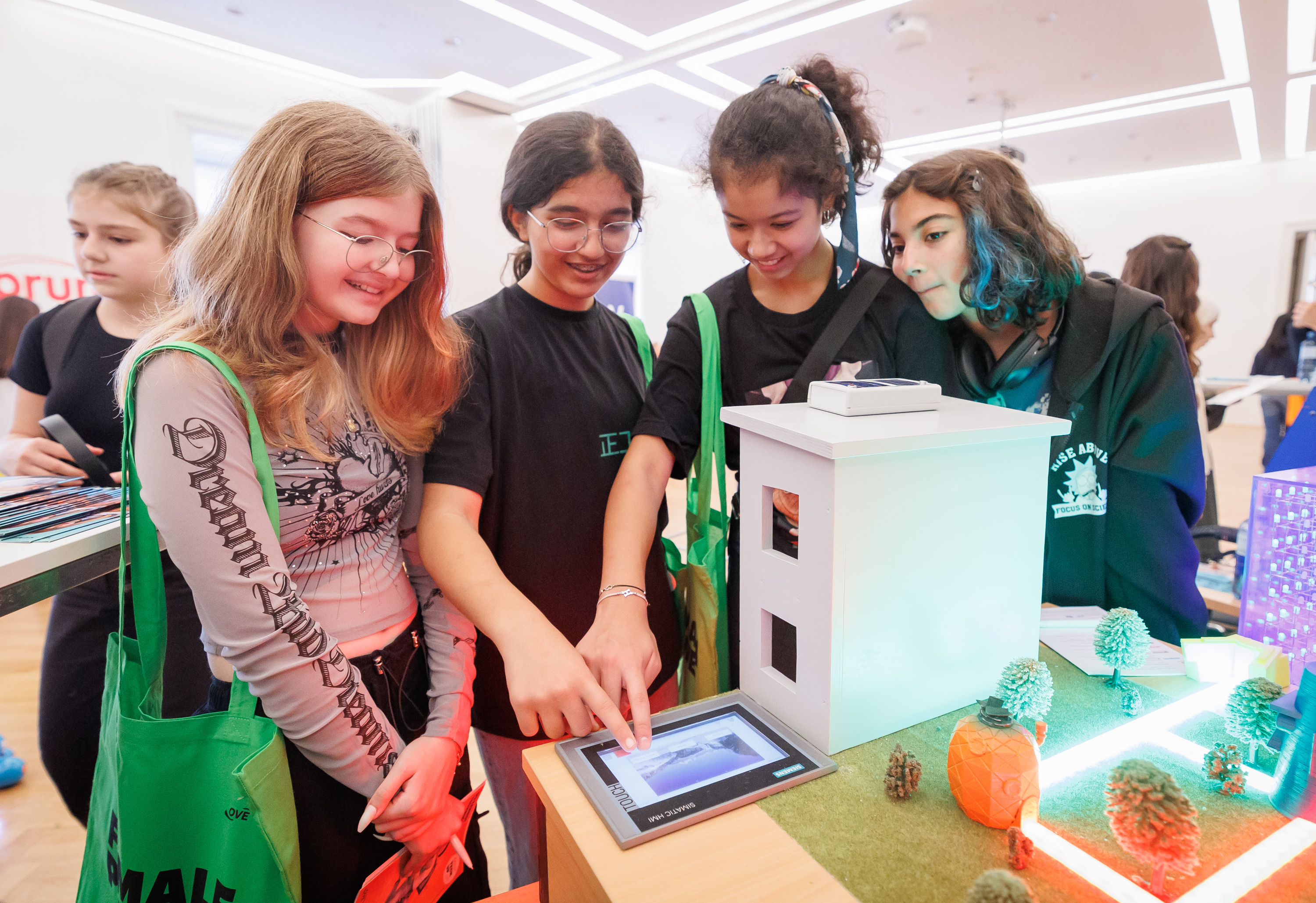 Mittels VR-Brille ein Dorf mit Strom versorgen, einen Roboter programmieren, Dioden zum Leuchten bringen oder einen Solarkäfer bauen: Bei den vielen Mitmachstationen konnten die Mädchen der Unter- und Oberstufe nicht nur ihr eigenes technisches Geschick testen, sondern auch weibliche Vorbilder kennenlernen und sich Karriere-Tipps aus erster Hand holen. „Angreifen, ausprobieren, Fragen stellen – bei Girls! TECH UP ist es uns besonders wichtig, dass die Mädchen mit der Technik tatsächlich in Berührung kommen. Es ist immer wieder schön zu sehen, mit welcher Begeisterung sich die Schülerinnen einbringen“, so Initiatorin Michaela Leonhardt.