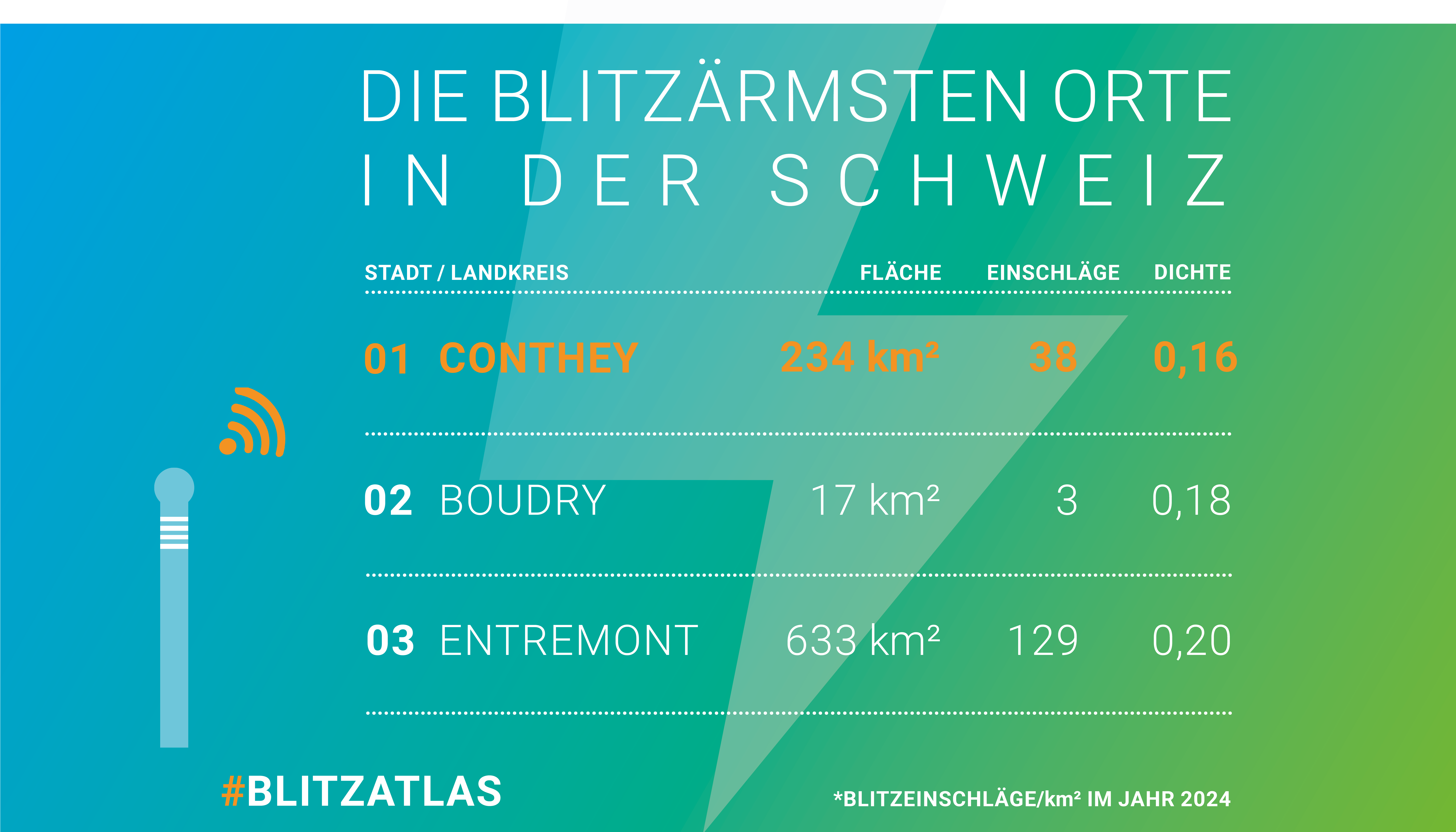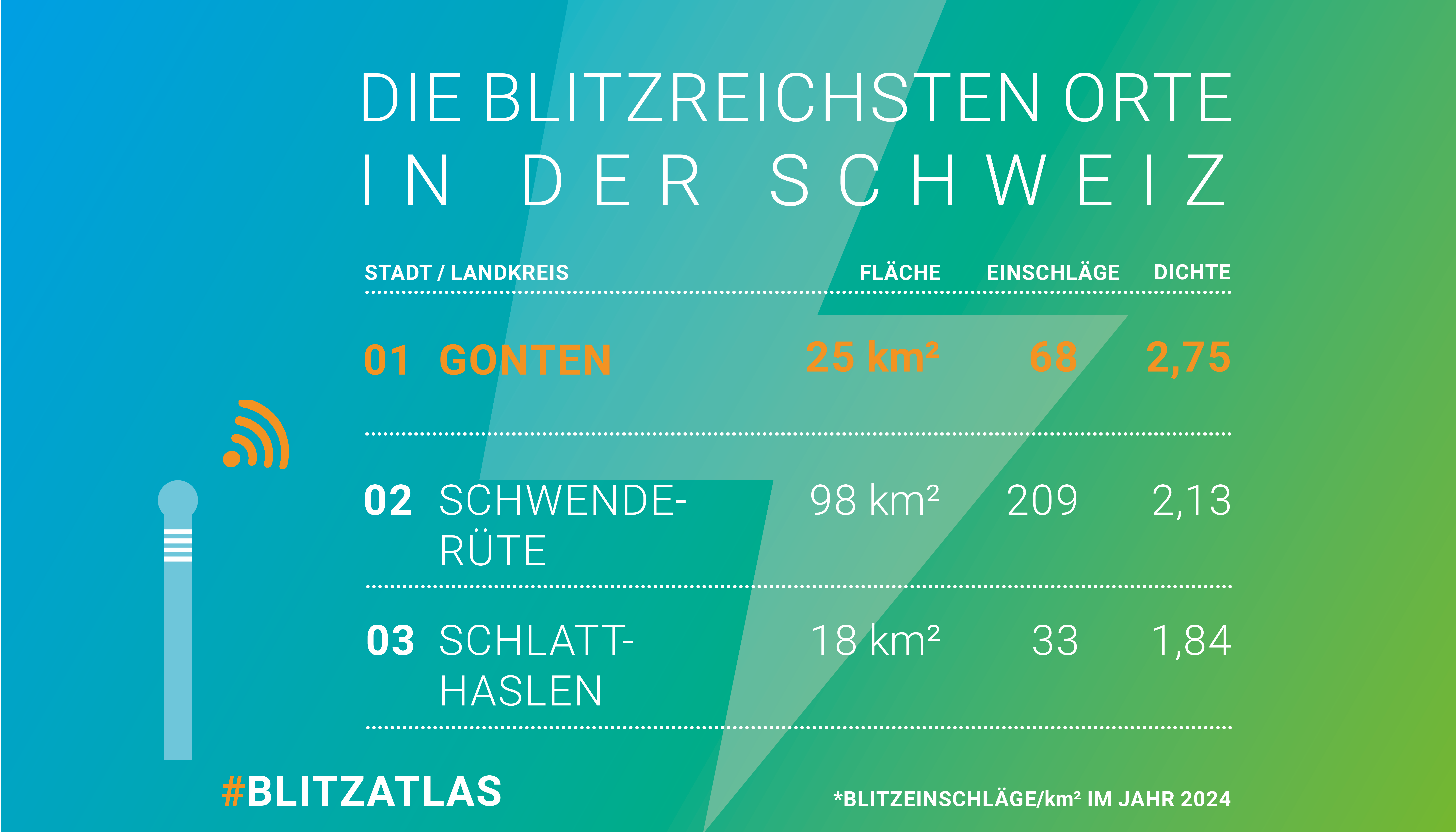Mit 2,75 Blitzeinschlägen pro Quadratkilometer und Jahr liegt Gonten an erster Stelle bei der Blitzdichte, gefolgt von Schwende-Rüte (2,13) und Schlatt-Haslen (1,84). Alle diese Bezirke liegen im Kanton Appenzell Innerrhoden, der damit auch die höchste Blitzdichte unter den Kantonen verzeichnete (2,0). Die geringste Blitzdichte ermittelte der Blitz-Informationsdienst in den Bezirken Conthey (0,16 Blitzereignissen pro Quadratkilometer und Jahr), in Boudry (0,18) und Entremont (0,20).