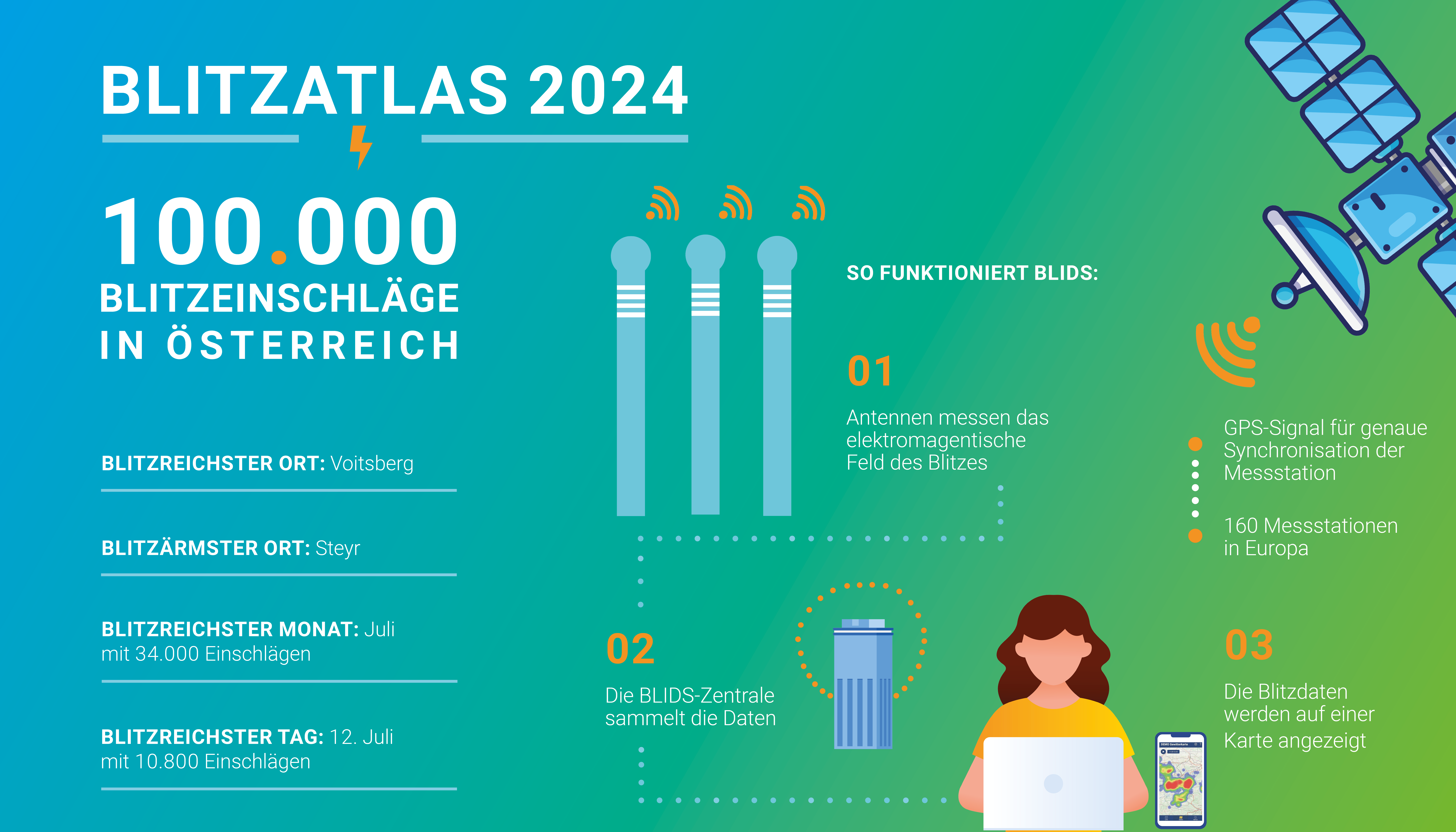 Auf Basis der Aufzeichnungen von rund 170 Messstationen in Europa versorgen ALDIS und BLIDS ihre Kunden mit aktuellen Blitzdaten. Dass diese Daten exakt und zuverlässig sind, zeigen Untersuchungen von Forscher:innen der TU Graz während der letzten 10 Jahre: Die Messungen haben für das Blitzortungssystem eine Ortungseffizienz von über 95 % bei einer Ortungsgenauigkeit von unter 100 Metern ergeben.