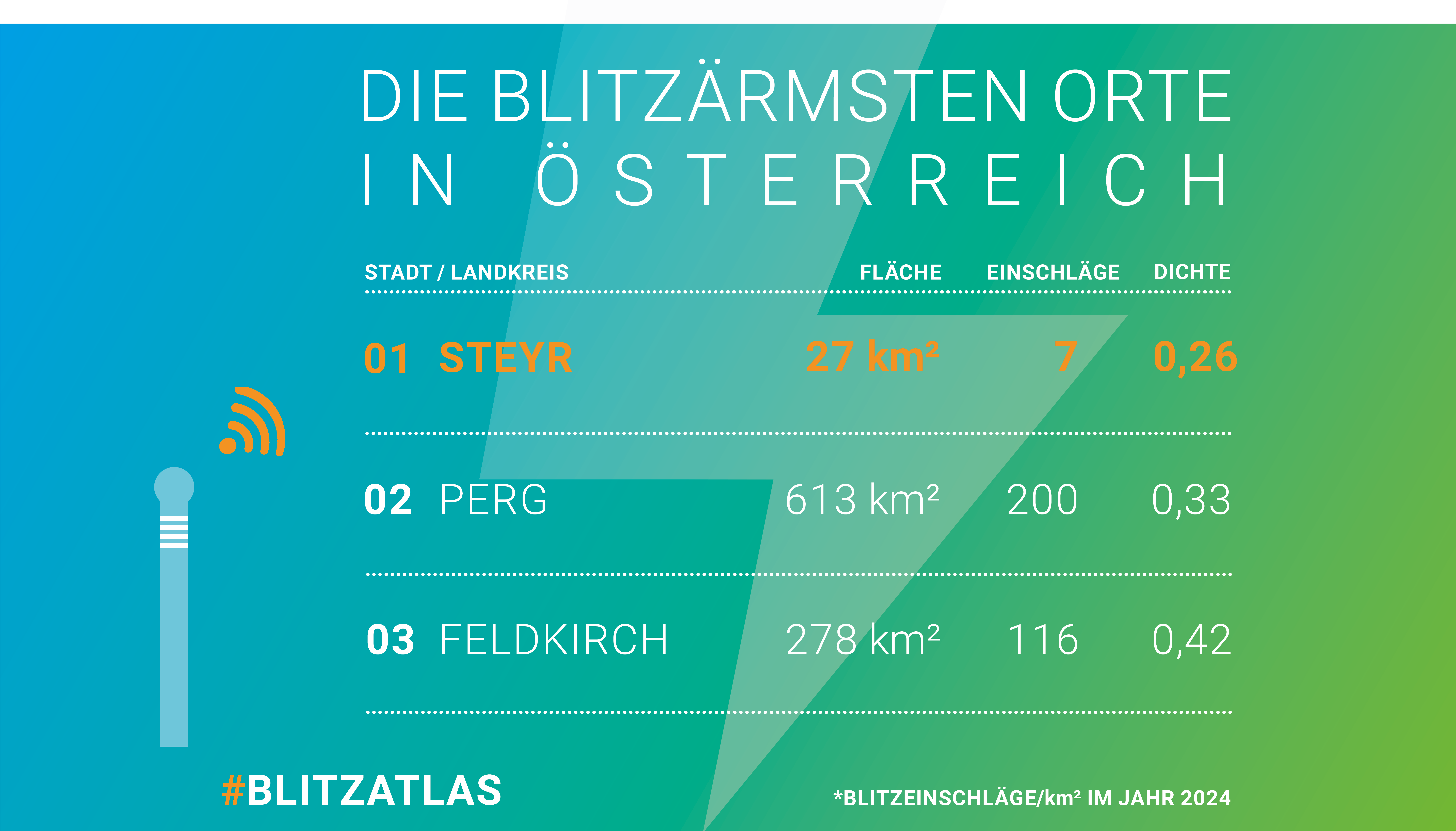 Mit 2,52 Blitzeinschlägen pro Quadratkilometer und Jahr liegt Voitsberg an erster Stelle bei der Blitzdichte, gefolgt von Bruck-Mürzzuschlag (2,26) und Krems an der Donau (Stadt) (2,11). Die geringste Blitzdichte ermittelte der Blitz-Informationsdienst in den Bezirken Steyr (Stadt) mit 0,26 Blitzereignissen pro Quadratkilometer und Jahr sowie in Perg (0,33) und Feldkirch (0,42). Die höchste Blitzdichte unter den Bundesländern verzeichnete wie in den letzten Jahren die Steiermark mit 1,63.
