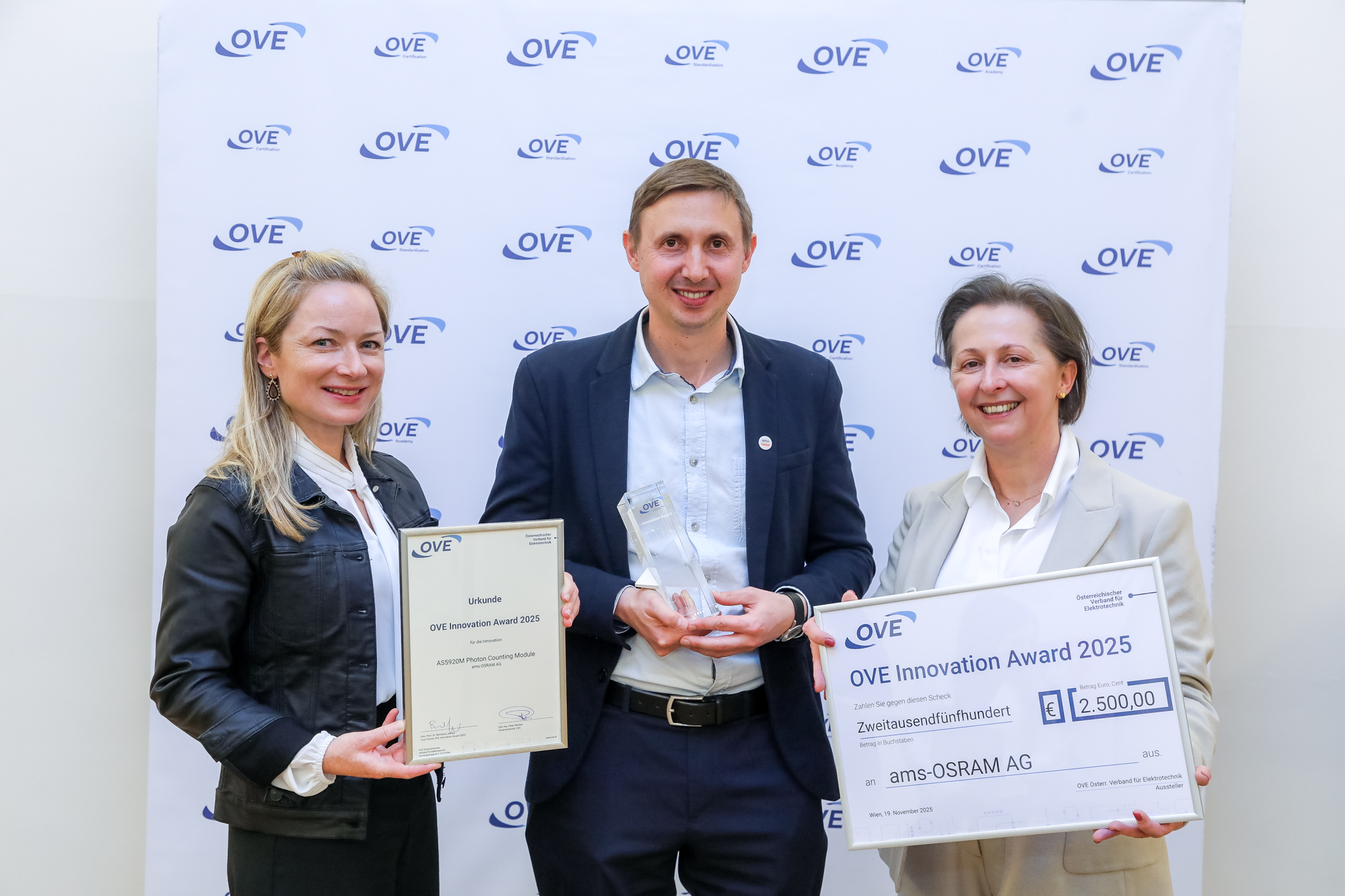 Der OVE Innovation Award 2025 geht an ein Projekt aus der Medizintechnik: Die ams-OSRAM AG wurde für ein innovatives Sensormodul ausgezeichnet, das in Computertomographen der nächsten Generation zum Einsatz kommt. Der neue Sensorchip ermöglicht durch das revolutionäre Photonen-Zähl-Verfahren genauere Diagnosen bei deutlich geringerer Strahlenbelastung. Der Award wurde am 19. November im Anschluss an den OVE Innovation Day übergeben.