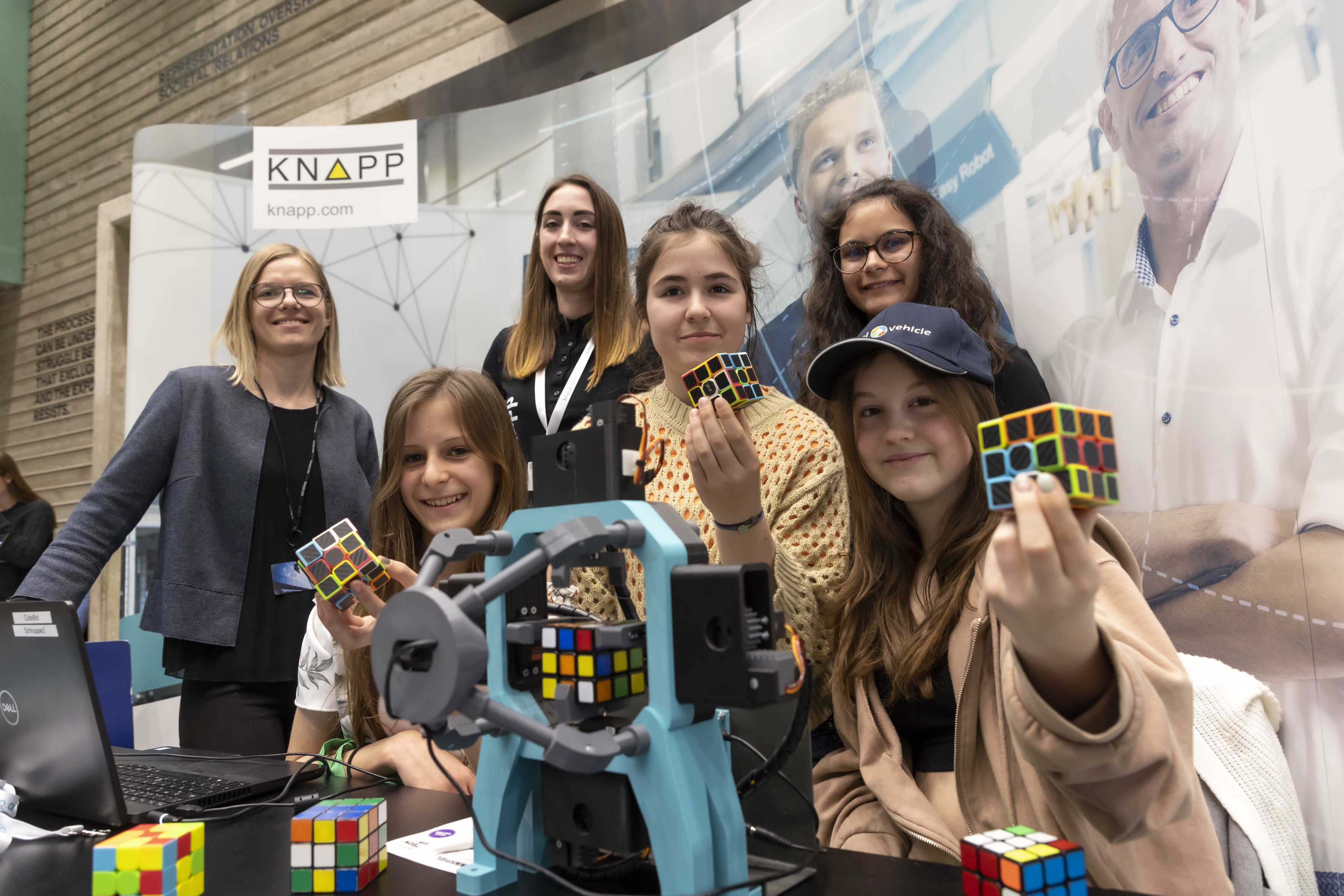 Einen Roboter einen Zauberwürfel lösen lassen, einen Elektromotor zum Laufen bringen oder mittels Anleitung einer HoloLens-Brille in wenigen Schritten eine Drohne bauen: Bei zahlreichen Mitmachstationen konnten die Schülerinnen ihr technisches Talent entdecken und auch gleich erste Kontakte zu Top-Unternehmen knüpfen. Neben Technik zum Angreifen gab es für die Mädchen bei Girls! TECH UP auch die Gelegenheit, Frauen in technischen Berufen kennenzulernen. Erfolgreiche Technikerinnen und Ingenieurinnen gewährten ganz persönliche Einblicke in ihren Werdegang und ihren Berufsalltag.