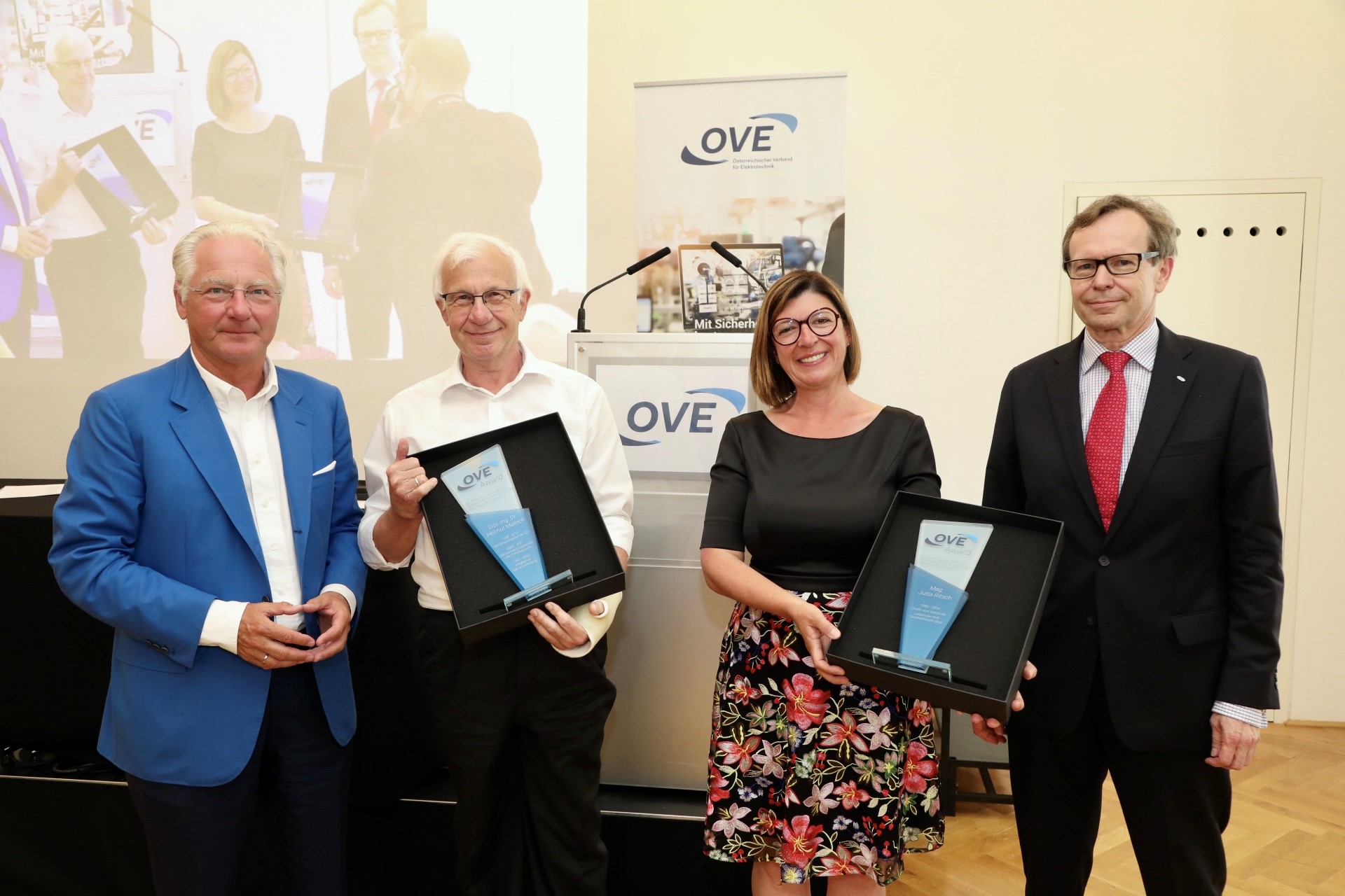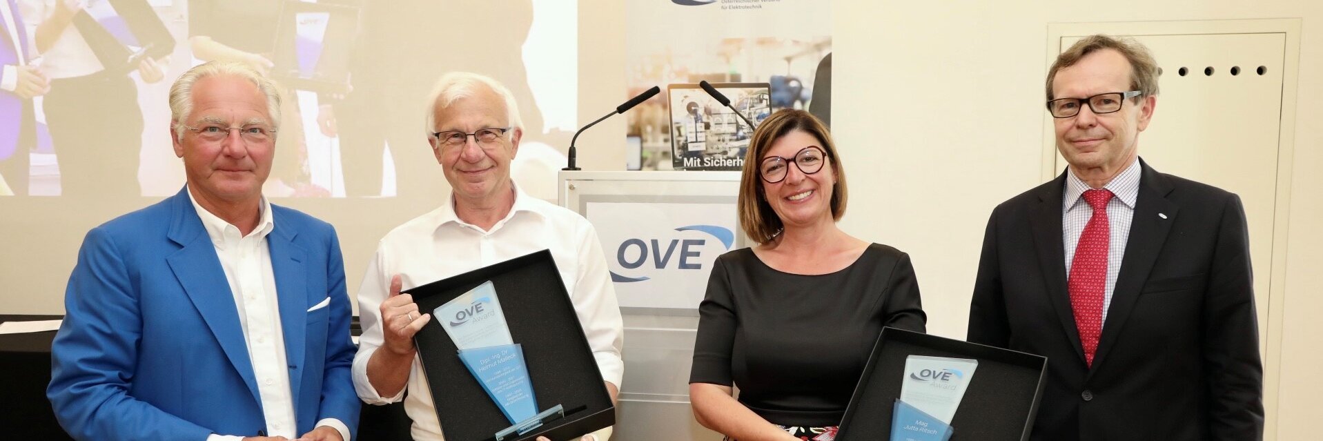 Im Rahmen der Generalversammlung wurden auch zwei Auszeichnungen vergeben. Dipl.‐Ing. Dr. Helmut Malleck erhielt den OVE-Award für seine langjährigen Verdienste um den OVE als Vorstandsmitglied der Gesellschaft für Informationstechnik, als Mitglied der Schriftleitung für die Verbandszeitschrift e&i sowie als Initiator und Organisator des IT-Kolloquiums, einer hochkarätigen Kooperationsveranstaltung des OVE mit dem AIT Austrian Institute of Technology und der TU Wien. Mit Mag. Jutta Ritsch wurde außerdem eine langjährige Mitarbeiterin des OVE ausgezeichnet. Die ehemalige Leiterin der Geschäftsstelle Graz, die 2020 aus privaten Gründen aus dem OVE ausgeschieden war, erhielt den OVE-Award für ihren jahrelangen außergewöhnlichen Einsatz, mit dem sie wesentlich zum Erfolg des OVE und insbesondere der Verbandzeitschrift e&i beigetragen hatte.